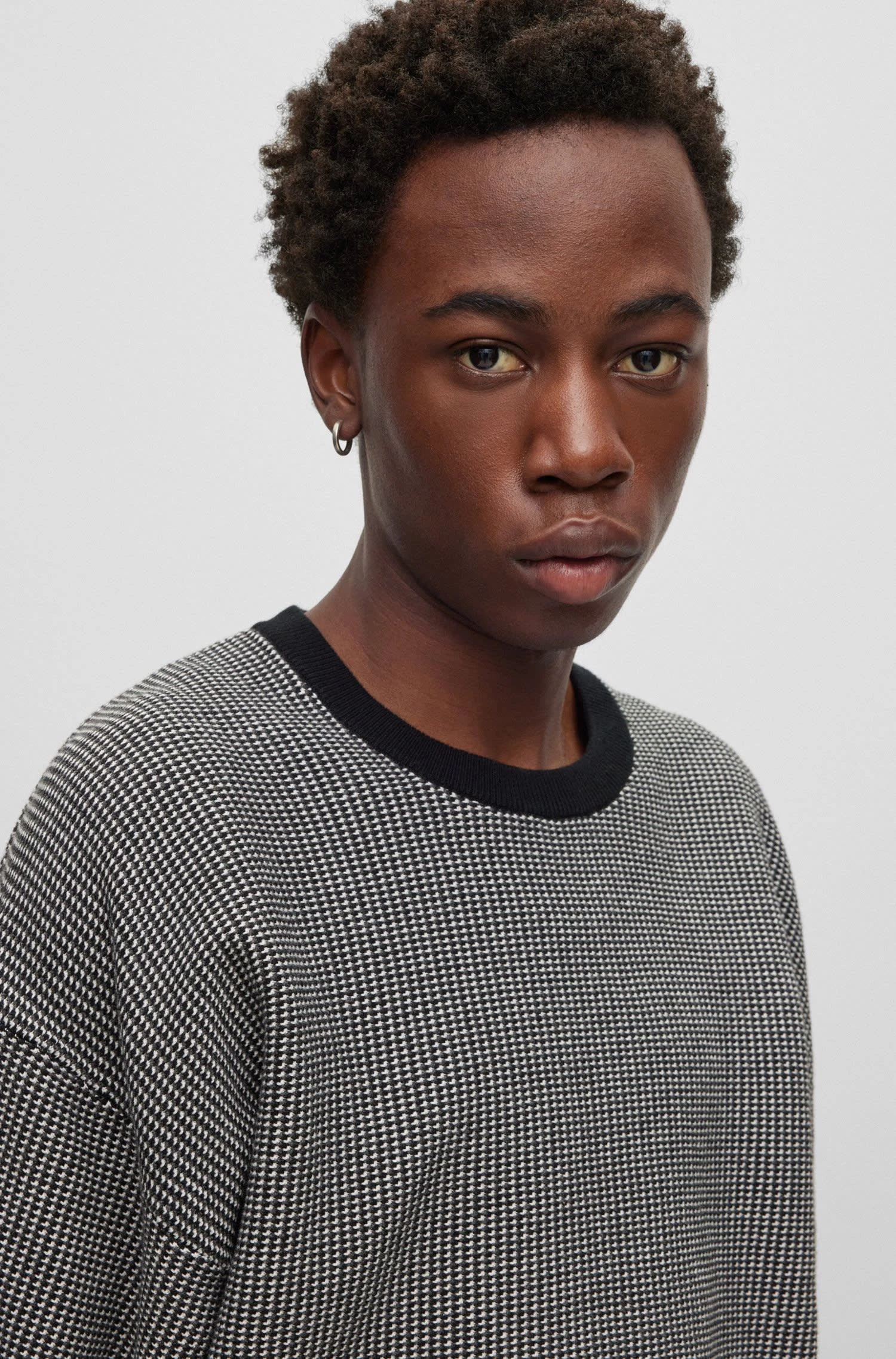 Locker geschnittener HUGO Pullover. Der Herren-Pullover mit Rundhalsausschnitt ist mit einer edlen Jacquard-Struktur gestrickt. Unifarbene Details und ein HUGO Logo-Etikett sorgen für einen charakteristischen Touch. Relaxed Fit / Lockere Passform Rundhalsausschnitt Lange Ärmel Mit schwarzen Rippstrickbündchen Logo-Emblem über dem Bündchen Pflegehinweise: Bleichen Nicht erlaubt, Bügeln geringe Temperatur, Nicht Trockner geeignet, Schonend reinigen mit Perchlorethylen, Sehr schonend waschen bei 30 °C Feinwäsche