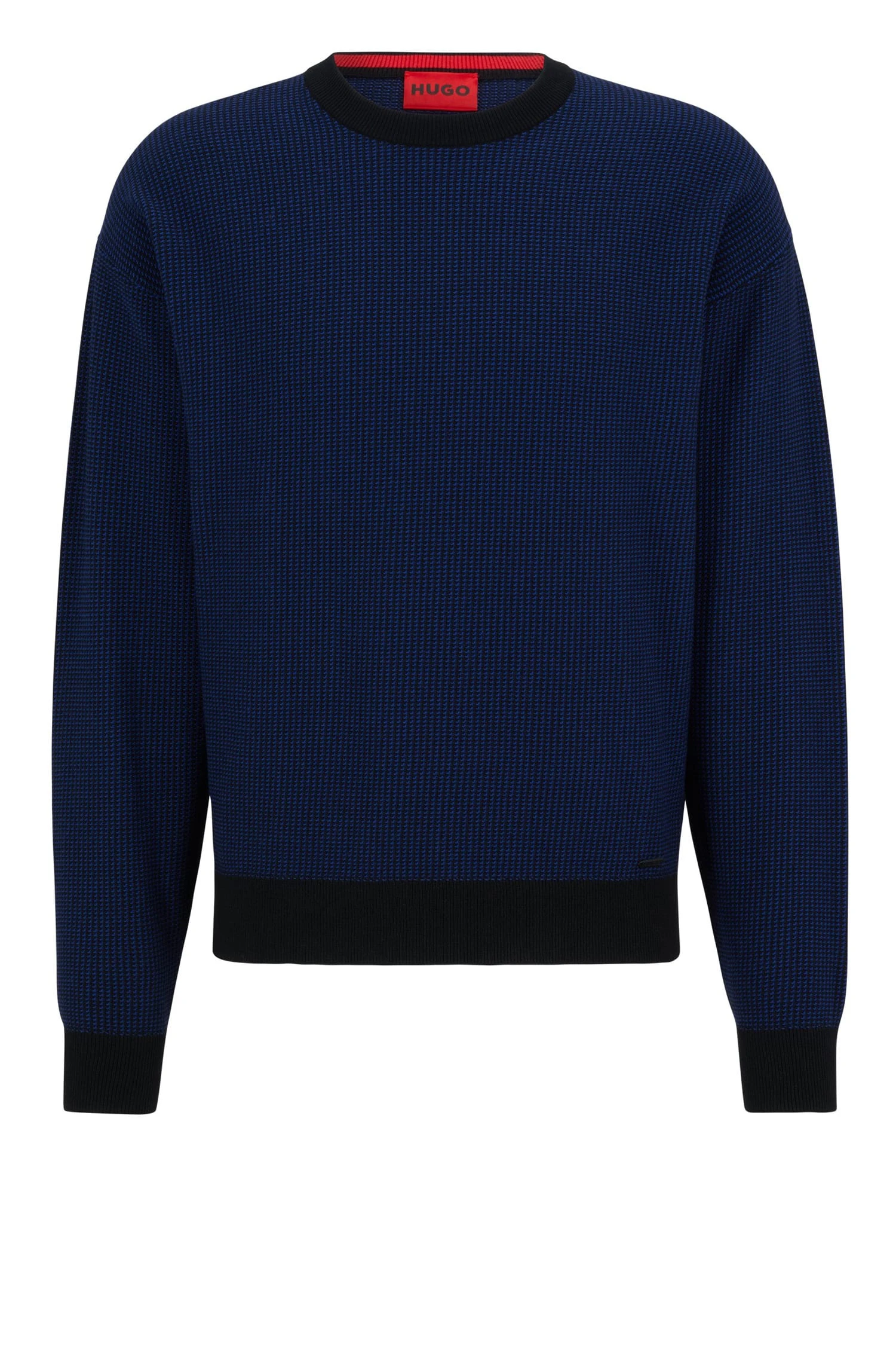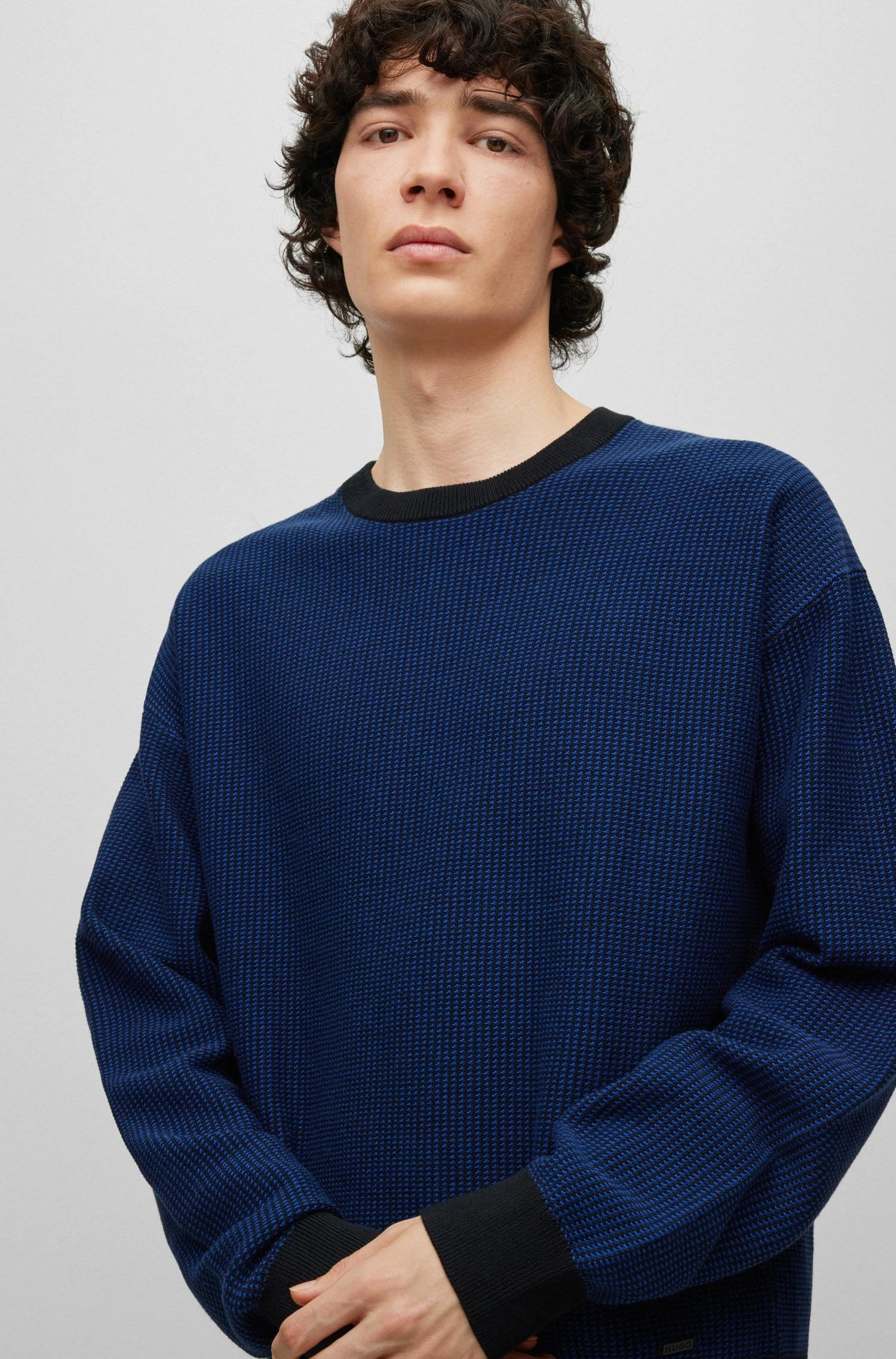Locker geschnittener HUGO Pullover. Der Herren-Pullover mit Rundhalsausschnitt ist mit einer edlen Jacquard-Struktur gestrickt. Unifarbene Details und ein HUGO Logo-Etikett sorgen für einen charakteristischen Touch. Relaxed Fit / Lockere Passform Rundhalsausschnitt Lange Ärmel Mit schwarzen Rippstrickbündchen Logo-Emblem über dem Bündchen Pflegehinweise: Bleichen Nicht erlaubt, Bügeln geringe Temperatur, Nicht Trockner geeignet, Schonend reinigen mit Perchlorethylen, Sehr schonend waschen bei 30 °C Feinwäsche