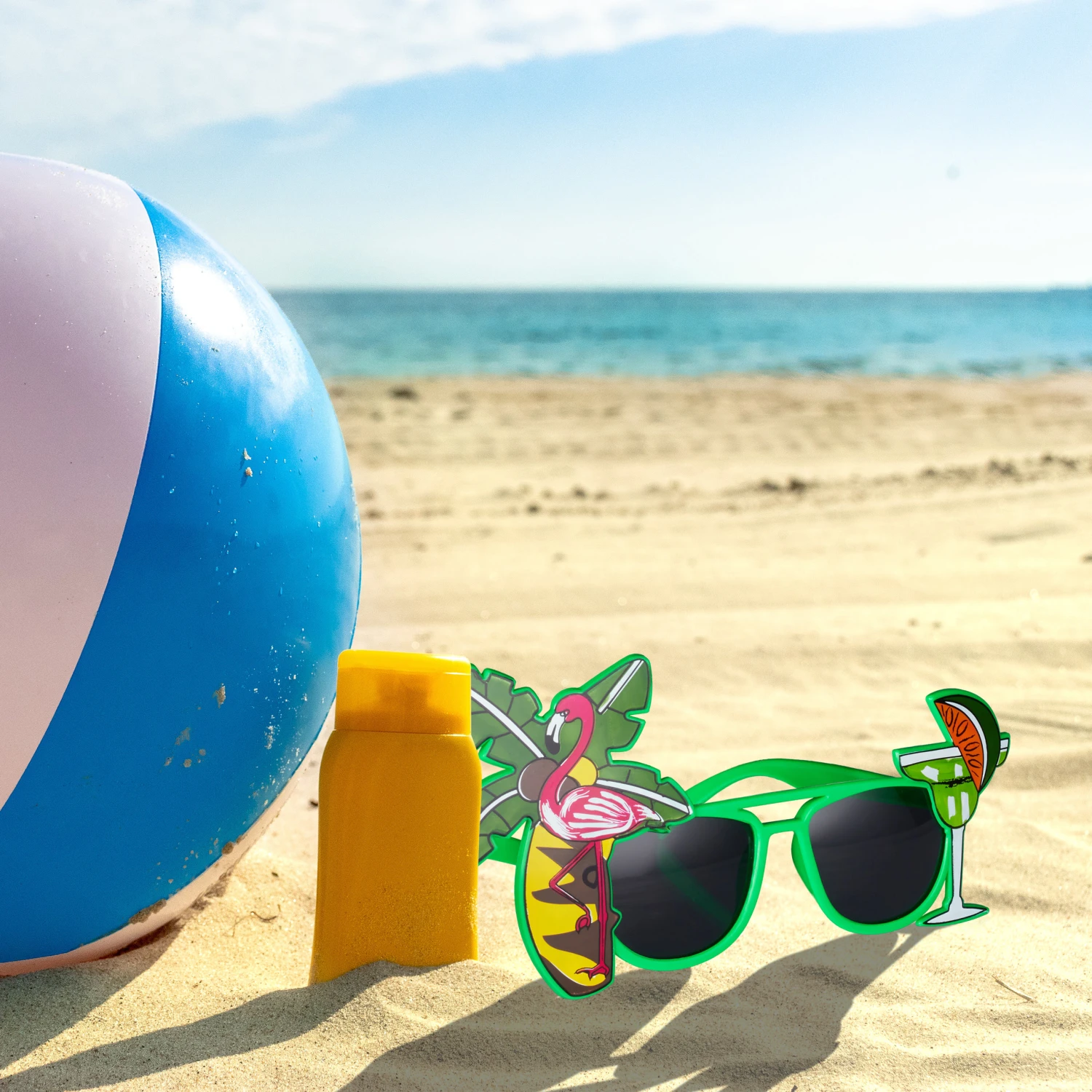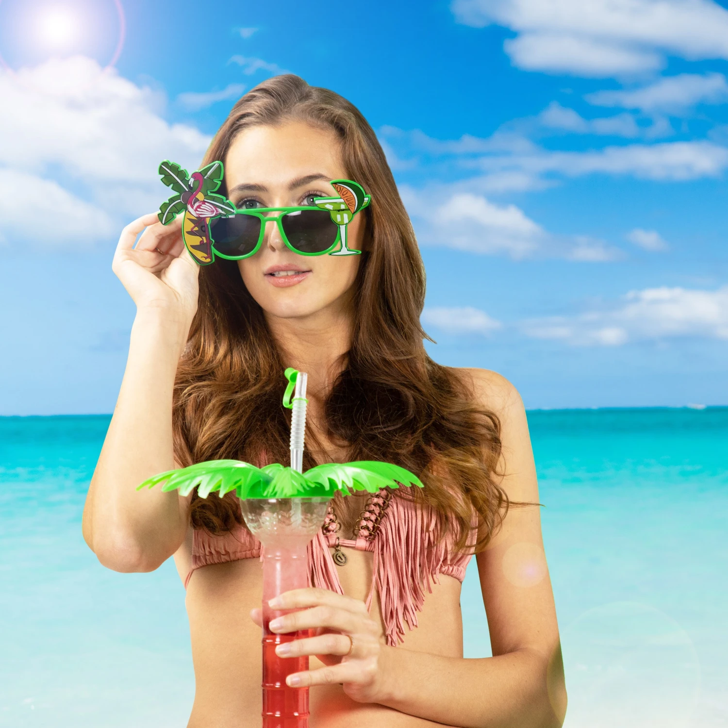 Bunte Spaßbrille mit Palme, Cocktail & Flamingo
